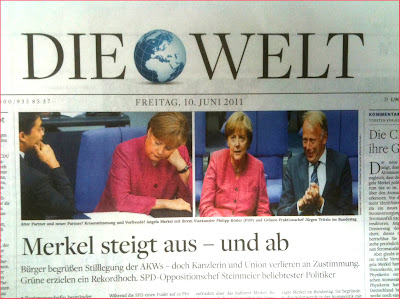 Beim Blick auf die Titelseite der heutigen Ausgabe der WELT, seriöse kleine Schwester der Sudelpostille BILD, muss man sich schon fragen: Was haben sich die Blattmacher da wohl bei gedacht. Die WELT ist ja qua Herkunft schon seit Amtsantritt eher eine Art freundlich kommentierende Mitarbeiterzeitung des Kanzler(innen)amtes und tat sich als solche mit brachialer Kritik naturgemäß immer schwer. Nun jedoch ein "Augenthaler-Memorial"-Bild als schlafende (nicht ganz so) Schöne. Und daneben wird sie in den Kasten gepresst, als wolle man ihr eine Schlankheitskur via Layout empfehlen. Oder wagt die Springerpresse so den Einstieg in den Ausstieg und meint, die Merkel soll sich mal langsam dünnemachen?
